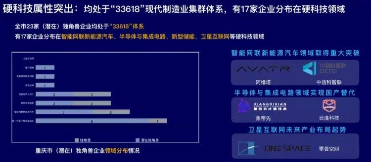2016至2023年,重慶獨(dú)角獸企業(yè)數(shù)量增長(zhǎng)的同時(shí),賽道分布也更加多樣,助力重慶構(gòu)建“33618”現(xiàn)代制造業(yè)集群體系。在智能網(wǎng)聯(lián)新能源汽車產(chǎn)業(yè),涌現(xiàn)出阿維塔科技、深藍(lán)汽車及已畢業(yè)獨(dú)角獸企業(yè)賽力斯;在新一代電子信息制造業(yè),涌現(xiàn)出專注于高端處理器芯片設(shè)計(jì)的新晉獨(dú)角獸企業(yè)象帝先。在金融科技、網(wǎng)紅爆品賽道也分別出現(xiàn)馬上消費(fèi)、江小白等獨(dú)角獸企業(yè)。