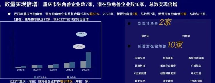 現(xiàn)場(chǎng),長(zhǎng)城戰(zhàn)略咨詢發(fā)布的《2024年度重慶市獨(dú)角獸、瞪羚企業(yè)榜單》顯示,近四年重慶市獨(dú)角獸、潛在獨(dú)角獸企業(yè)數(shù)復(fù)合增長(zhǎng)率均超60%,2023年,新晉獨(dú)角獸2家,總數(shù)到7家,新晉潛在獨(dú)角獸10家,總數(shù)達(dá)16家,(潛在)獨(dú)角獸企業(yè)總數(shù)達(dá)23家,較2022年的11家實(shí)現(xiàn)倍增。